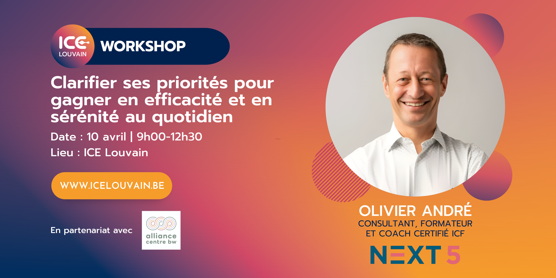 En collaboration avec Alliance Centre BW et ICE Louvain, cet atelier s’adresse aux entrepreneur·es et dirigeant·es qui souhaitent mieux gérer leurs priorités, réduire la pression quotidienne et gagner en efficacité sans s’épuiser. Animé par un expert de haute qualité, il propose une approche concrète, directement ancrée dans les réalités du terrain entrepreneurial.