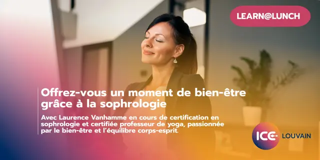 Rejoignez-nous pour un learn@lunch de bien-être, le 7 octobre 2025 de 12h30 à 13h30 (salle Louvain) proposé par Laurence Vanhamme, en cours de certification en sophrologie et certifiée professeur de yoga, passionnée par le bien-être et l’équilibre corps-esprit.