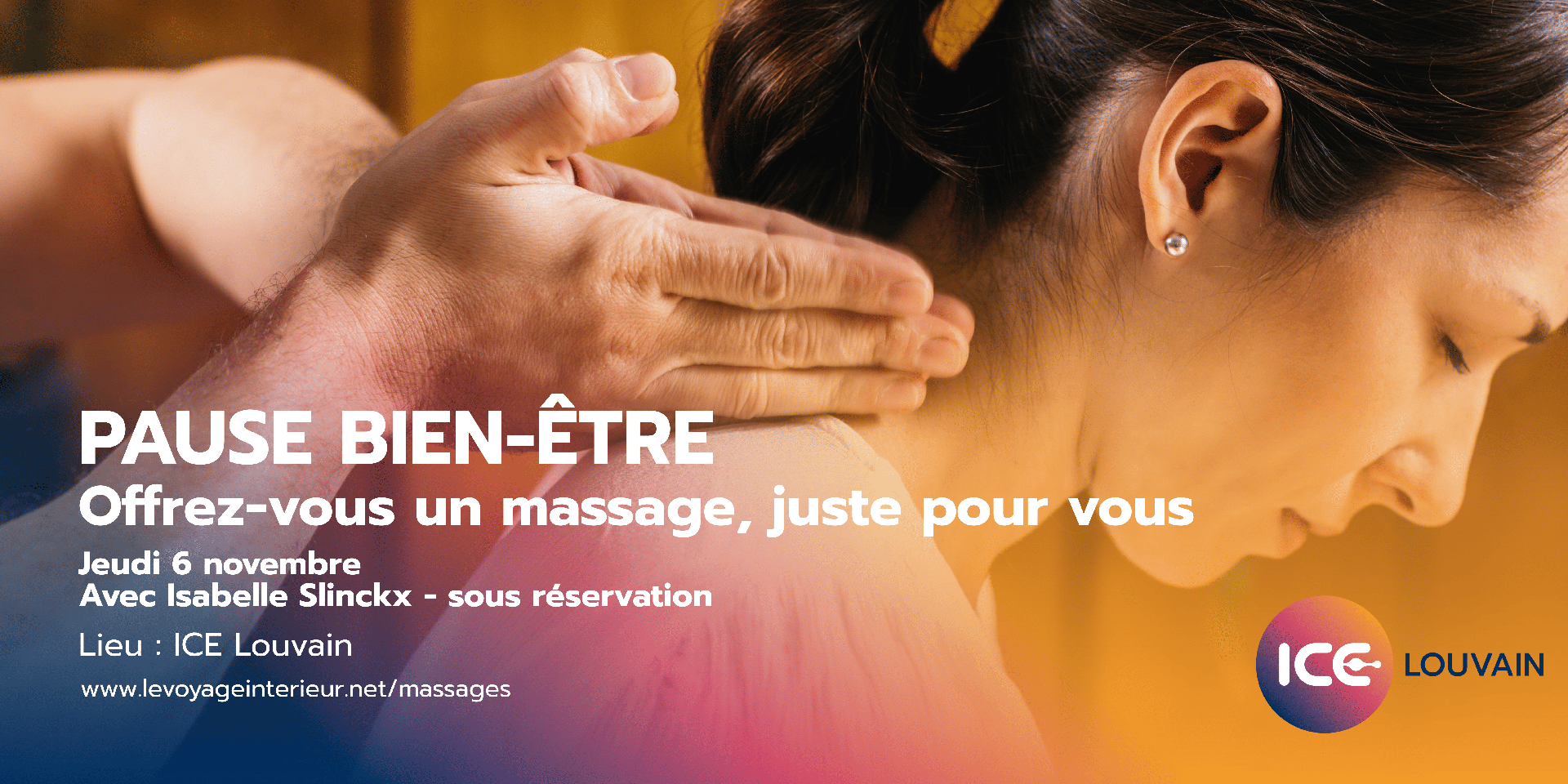 Les jeudis 30 octobre et 6 novembre, Isabelle Slinckx – Le Voyage Intérieur – installe son espace massage à ICE Louvain. Elle apporte tout son matériel pour vous permettre de relâcher les tensions, apaiser le mental et repartir reboosté·e.